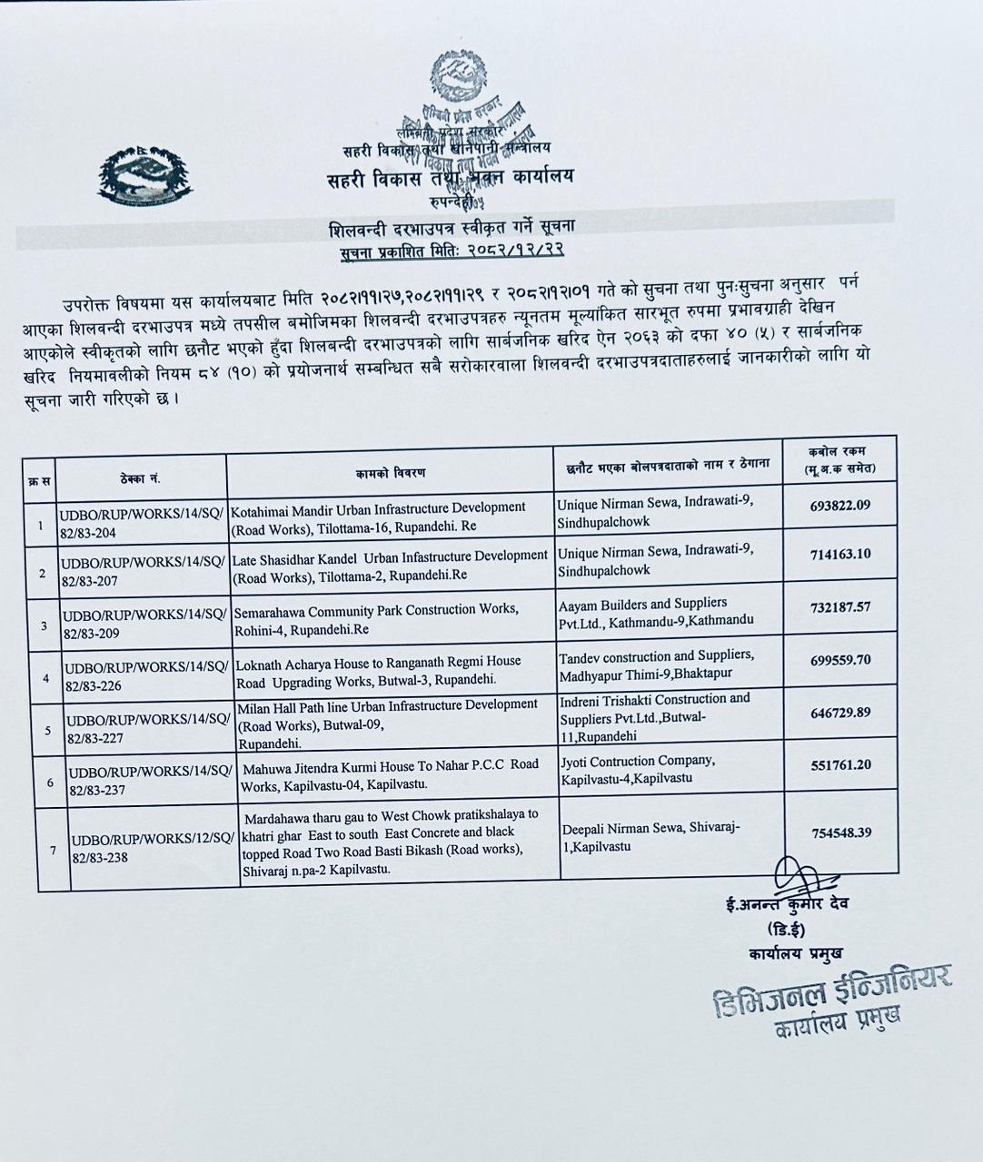 शिलबन्दी दरभाउपत्र स्वीकृत गर्ने सूचना ।