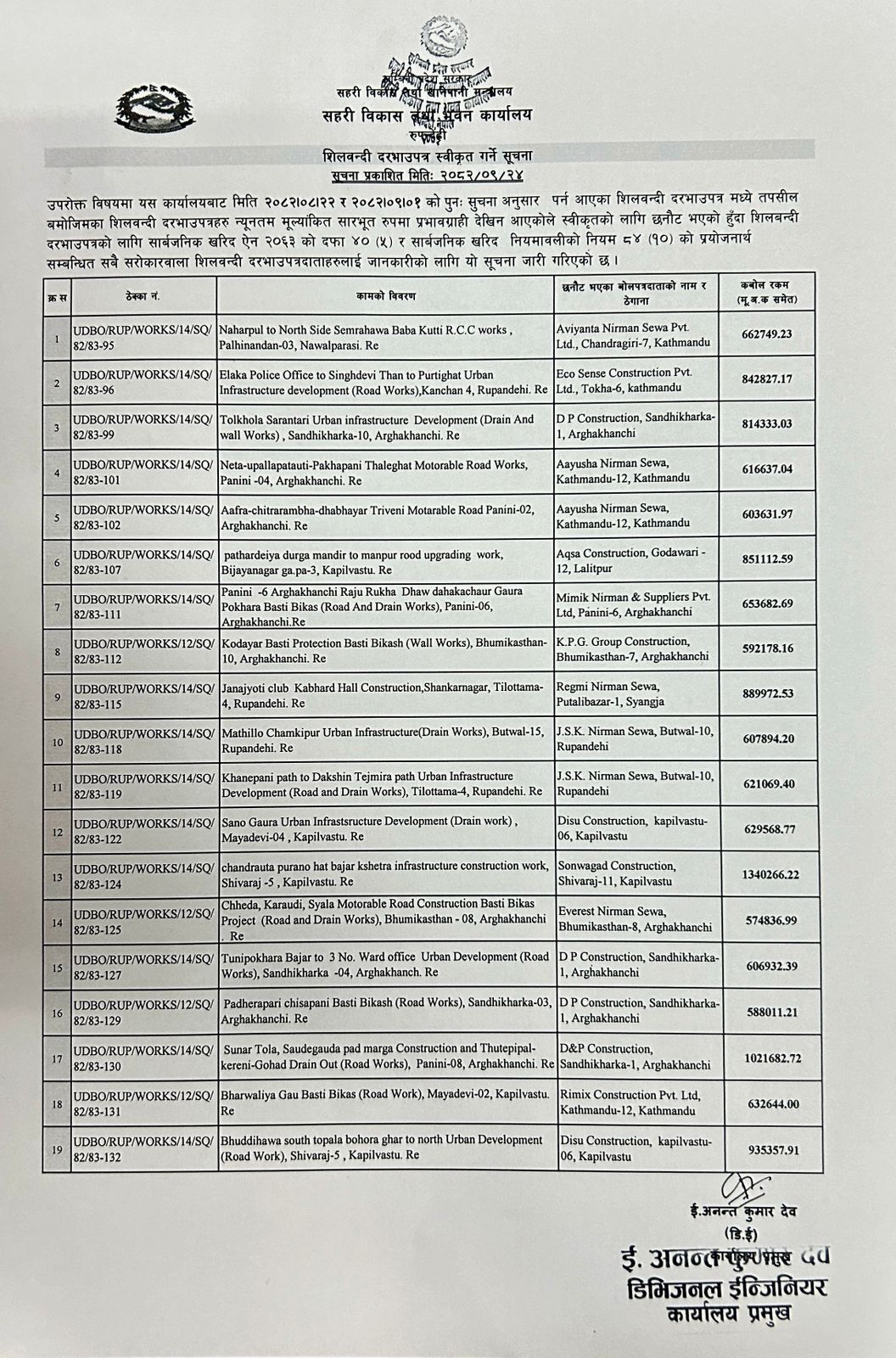 शिलबन्दी दरभाउपत्र स्वीकृत गर्ने सम्बन्धी सूचना