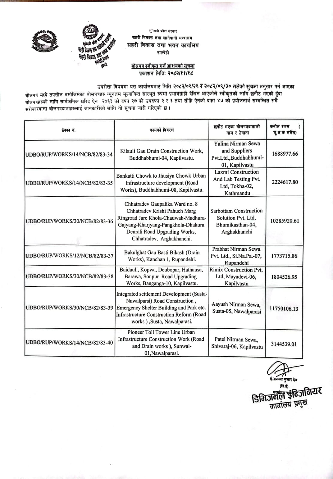 फागुन १८, २०८२ बोलपत्र स्वीकृत गर्ने आशयको सूचना।